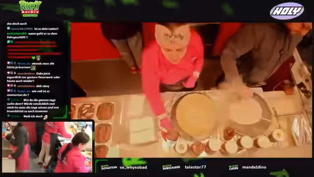 00:12:49Innerhalb des Betriebs werden die Arbeitsabläufe gezeigt: Teig wird mit einer großen Maschine frisch zubereitet und die Cremes werden auf speziellen, starken Platten gebraten. Der Streamer, der hauptsächlich für den Unterhalt des Chats und nicht für den Verkauf zuständig ist, weist auf die hohe Sauberkeits- und Sicherheitsstandards im Schaustellerbereich hin. Als geplantes Event für den Abend wird ein Besuch eines Fahrgeschäfts angekündigt, falls die Sicherheitsbestimmungen dies erlauben.