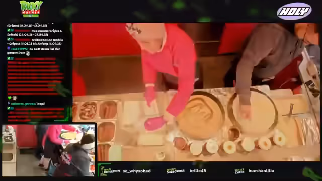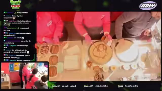 00:01:18Nach einem kurzen Willkommen im Chat stellt der Streamer vor, dass er sich an einem Stand mit Crepes während des Hamburger DOMs befindet. Er erwähnt, dass die Mitarbeiter überrascht seien, dass er hier streamt, da sie es nicht vorher wussten. Trotz anfänglicher technischer Schwierigkeiten mit der Kamera und Laptop-Positionierung zeigt er sich erfreut über den Andrang und die geschäftige Atmosphäre am Stand, der für den Streamer wie ein Fließband wirkt.