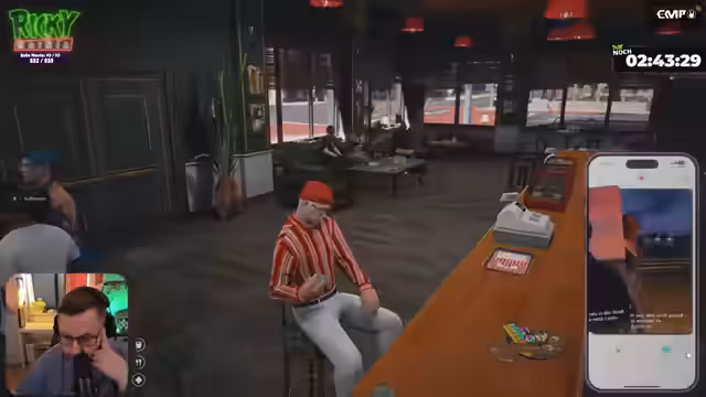 08:43:43Der Stream wird durch interaktive Elemente und humorvolle Aktionen aufgelockert. Eine Bewerbungssituation wird gespielt, bei der die Bewerber unterhalten müssen. Anschließend entwickelt sich eine Diskussion über einen Dresscode für das Personal, wobei schwarz und grau als Farben favorisiert werden. Ein Höhepunkt ist das 'Ladies Night'-Konzept, das zum Tanzen animieren soll, was zu lustreichen Situationen und gegenseitigen Provokationen führt.
