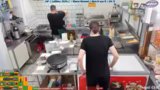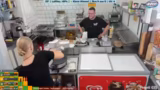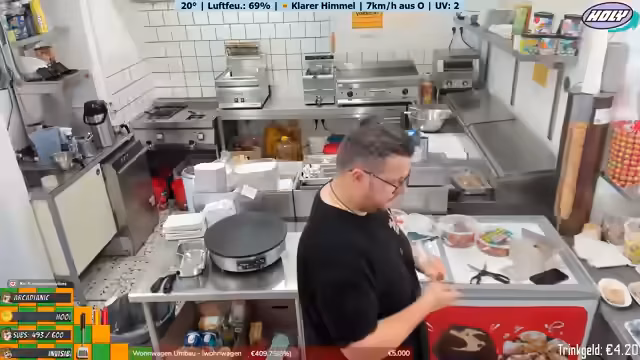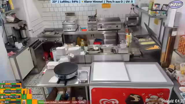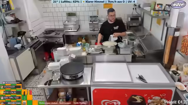 03:50:00Der Streamer beschreibt das Tagesgeschäft im Imbiss. Er nimmt Bestellungen auf, bereitet Essen zu und spricht mit den Gästen. Es gibt immer wieder kleine Probleme, wie die mangelnde Kleingeldreserve. Die Preise werden genannt und die Speisekarte erklärt. Der Streamer ist oft allein mit den Gästen und muss auf viele Dinge gleichzeitig achten. Er unterhält sich mit den Gästen und erzählt Anekdoten aus seinem Alltag und seiner früheren Arbeit beim Bäcker.