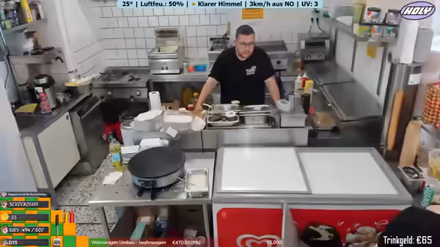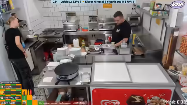 05:39:47Der Alltag des Imbisses wird weiter beleuchtet, mit Abläufen wie der Reinigung und der Zubereitung von Speisen. Die Zählung der Bestellnummern bis 1000 ist ein wiederkehrendes Thema und wird als Milestone gefeiert. Die Spendenziele bleiben weiterhin zentral, wobei Lottie auf die verbleibende Summe hinweist und die Chat-Community zum Spenden aufruft.