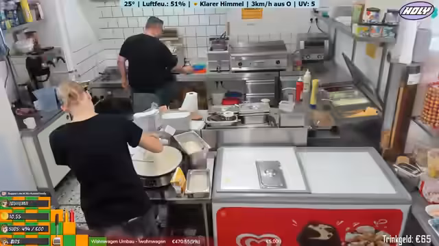 06:49:39Der Stream zeigt den Arbeitsalltag im Freibad Imbiss aus der Perspektive der Mitarbeiterin Kira. Es werden zahlreiche Bestellungen von Gästen entgegengenommen und bearbeitet. Dazu gehören verschiedene Gerichte wie Currywurstpommes, Nuggets, Pommes mit Ketchup oder Mayo, Hamburger und auch Getränke. Der Fokus liegt auf der effizienten und korrekten Abwicklung der Bestellungen, inklusive des korrekten Preisberechnens und der Vermeidung von Fehlern. Die Mitarbeiterin arbeitet zügig und interagiert dabei auch mit anderen Kollegen.