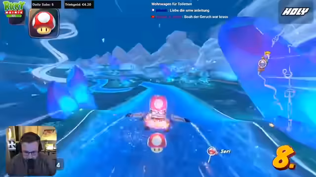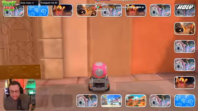 02:35:31Der Streamer beginnt sein erstes Mario Kart World-Abenteuer und stellt fest, dass der Chat, auch bei einem gemeinsamen Call, nicht zu überwältigend sei, da er sich Zeit zum Lesen und Antworten nehmen könne. Zunächst wird die Steuerung des Spiels als ungewohnt beschrieben und er klagt über Probleme mit der Verbindung und Latenz, die sich durch Drücken der Knöpfe zu schnell ergibt, was zu Verbindungsabbrüchen und dem Verlust der Kontrolle über den Charakter führt. Er vergleicht die Online-Erfahrung auf der Switch mit der auf dem PC, wobei Letztere ihm zwar besser bekannt sei, aber nicht zur Verfügung stehe. Chad, ein weiterer Spieler, scheint die technischen Schwierigkeiten weniger zu bemerken oder zu stören.