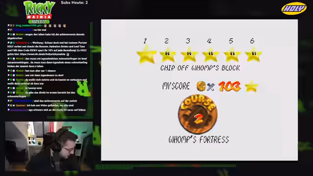 01:54:02Der Streamer hat Mario 64 erfolgreich mit 120 Sternen abgeschlossen und sich damit das erste Hauptziel erreicht. Er hat bei diesem Durchgang einige Achievements mitgesammelt, konzentriert sich aber vorerst auf das Beenden der Runde. Anschließend erwähnt er weitere Spielideen wie Sonic Adventure 2 und GTA San Andreas für zukünftige Streams. Er gibt vor, spätestens um 16:30 Uhr aufhören zu müssen, um noch einkaufen zu gehen, und beendet damit den Stream.