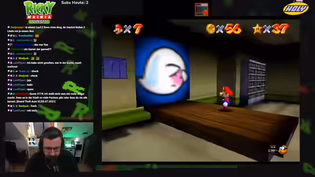 00:55:48Es wechseln sich spielerische Inhalte mit persönlichen Einblicken ab. Der Streamer spricht über seine Geburtstagspläne und erwähnt eine anstehende Therapie für seine Depressionen. Er hat mit internetbasierten Übungen begonnen, die ihm bei seinem Zustand helfen sollen, bis eine Therapeutin gefunden ist. Diese persönliche Einblicke unterbrechen die anhaltenden Versuche, die schwierigen Mario-64-Challenges zu meistern, was seine emotionale Beteiligung am Stream zeigt.