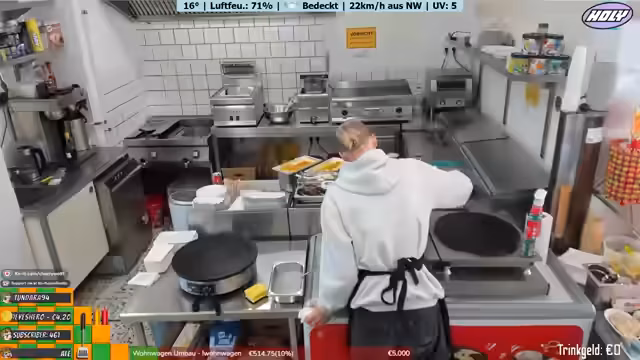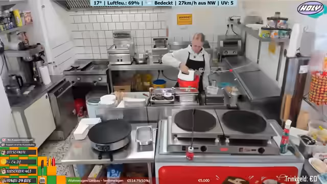 00:04:23Der Streamer bereitet die Küche für den Abend vor. Es werden Arbeiten am Crepe-Gerät, das Teiggerät wird geputzt und die Currysoße zubereitet. Dabei erwähnt er den hohen Wert des Geräts von 1500 Euro und die Bedeutung der Gusseisenplatte für eine konstante Hitze. Der Fokus liegt auf der Vorbereitung für den bevorstehenden Cocktailabend und die Event-Küche.