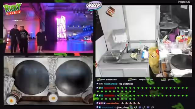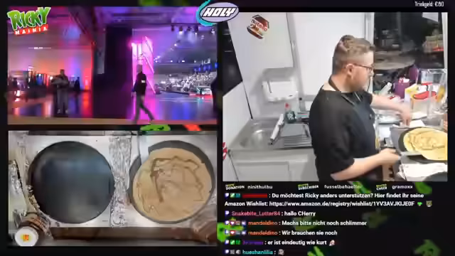 00:13:17Der Fokus liegt auf dem reibungslosen Verkauf von Crêpes. Streamer und Mitarbeiter erklä den Kunden die verschiedenen Belagsoptionen, wie Käse, Schinken, Nutella oder Bananen, und verwalten die Preise, die zwischen 6 und 14 Euro liegen. Es kommt zu technischen Schwierigkeiten mit einem TV-Ständer und einem Glaskocher, der heiß ist und Verbrennungsgefahr birgt. Die Kunden werden angesprochen und der Streamer zeigt die gesamte Messeumgebung im Hintergrund.