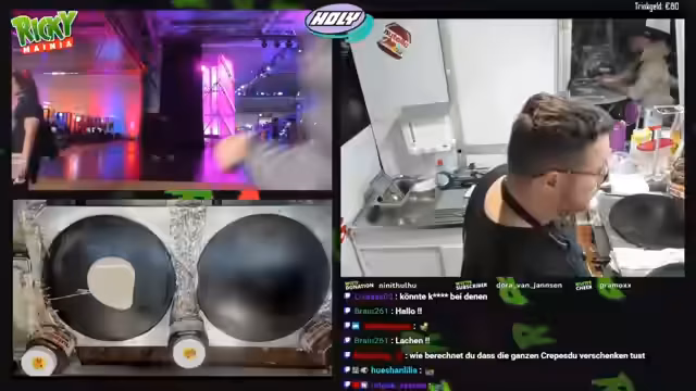 01:47:32Es herrscht reger Betrieb am Crêpes-Stand. Kundenwünsche werden entgegengenommen, von süßen Varianten mit Zimtzucker, Kinderriegel oder Nutella bis hin zu herzhaften Optionen mit Apfelmus oder Banane. Es gibt Interaktionen über das Bezahlen, Wechselgeld und die korrekte Zusammenstellung der Crêpes. Der Streamer interagiert freundlich mit den Kunden, nimmt Bestellungen auf und gibt Empfehlungen. Es wird über Zutaten gesprochen und auf Sonderwünsche eingegangen. Es wird auf die Qualität der Produkte geachtet und sichergestellt, dass die Kunden zufrieden sind. Es gibt auch einige lustige Momente, wie Verwechslungen bei Bestellungen oder kleine Missgeschicke, die aber alle mit Humor genommen werden. Der Verkäufer bietet auch Alternativen zu anderen Caterern an und verweist auf das eigene Angebot an Hot Dogs, Pommes und Bratwurst. Die Zubereitung der Crêpes wird gezeigt und erklärt, wobei auf Hygiene und Sauberkeit geachtet wird. Es wird auch auf die Vorbereitung des Teigs für den nächsten Tag eingegangen.