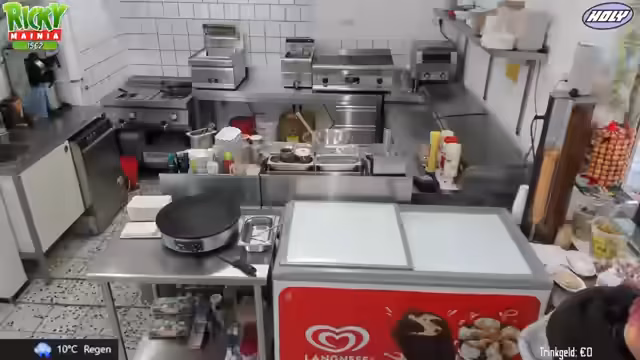 00:03:26Der Stream beginnt mit dem Check der Kamera und der Beschreibung des heutigen Sturmwetters. Der Fokus liegt auf der Vorbereitung der Slush-Eis-Maschine. Hierfür werden verschiedene Mischungsverhältnisse für unterschiedliche Sorten getestet. Der braune Slush muss flüssiger gemacht werden, damit er später richtig gefriert. Gleichzeitig wird die unvorhergesehene Abwesenheit der üblichen Schwimmergruppe thematisiert, was die Planung für den Kaffee behindert.