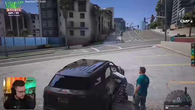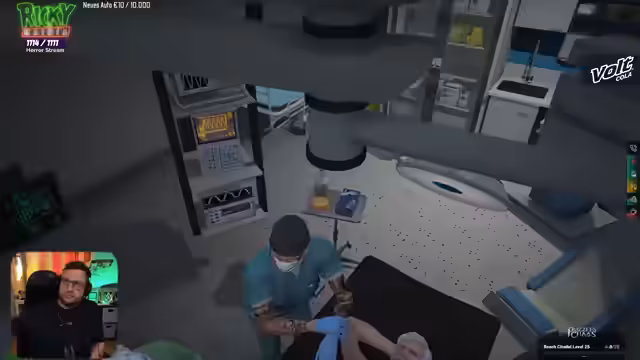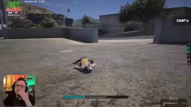 00:24:26Nach erfolgreicher Modinstallation betritt der Streamer das Spiel mit seinem Charakter Erich. Er erwähnen erneut den Verkauf seines Mini-Countryman und die Suche nach einem neuen Transporter, der mindestens zweieinhalb Tonnen ziehen und Platz für drei Personen bieten muss. Nach einer kurzen Zeit im Spiel wird Erich von einem Mitspieler angegriffen und verletzt, was einen Einsatz der Sanitäter (EMS) erforderlich macht. Dort wird er behandelt, nachdem ihm ein Messer zugefügt wurde.
