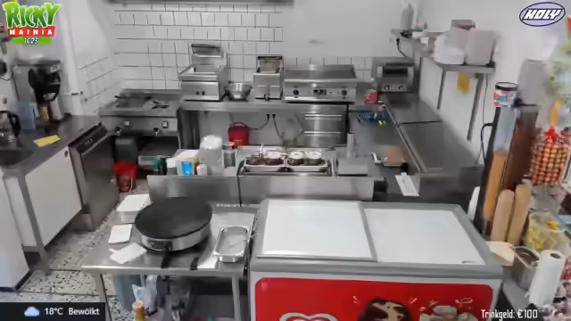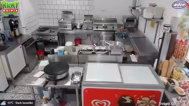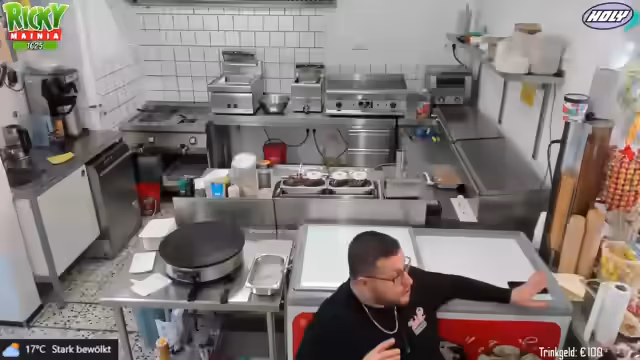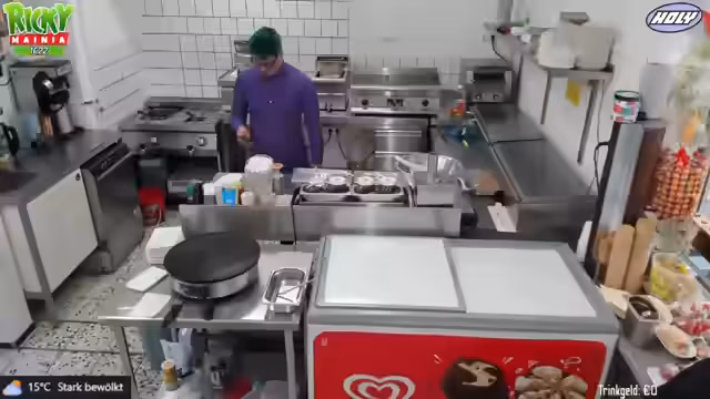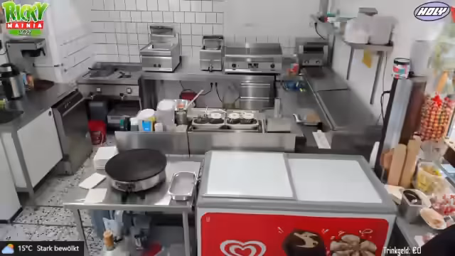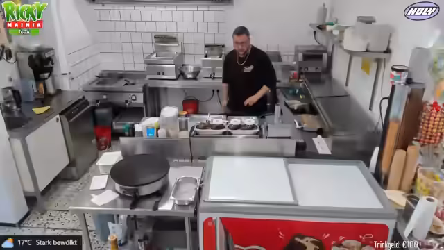 02:41:24Die Streamerin präsentiert die Speisekarte des Imbisses und stellt verschiedene Snacks und Eiscremesorten vor. Besonders ein neues Eis namens Schmackofatz wird empfohlen, welches Bienen-Eis mit Vanille, Erdbeersauce und Schoko-Stückchen enthält. Währenddessen werden Kunden bestellt und bedient, wobei auch die Zubereitung von Crêpes erwähnt wird. Die Arbeitsabläufe und die Zubereitung der Speisen werden dabei erläutert.