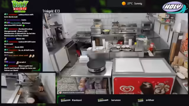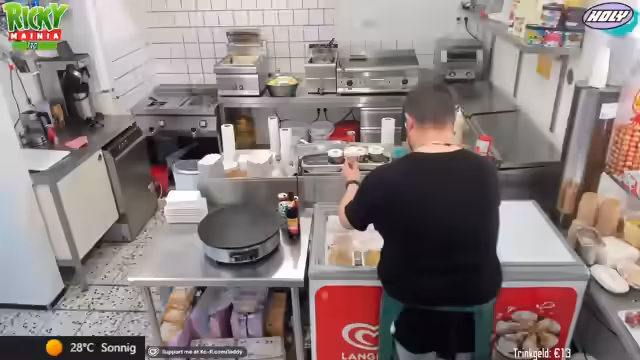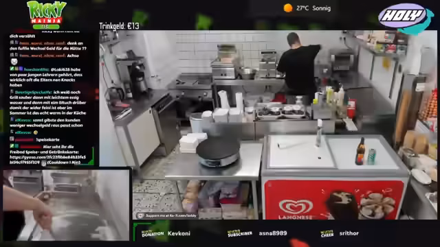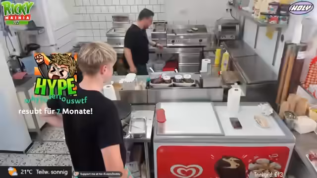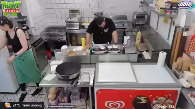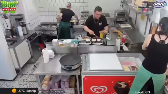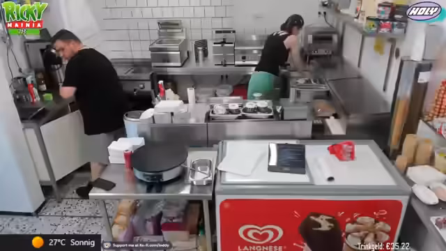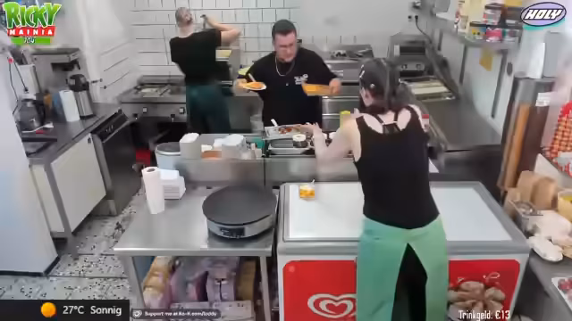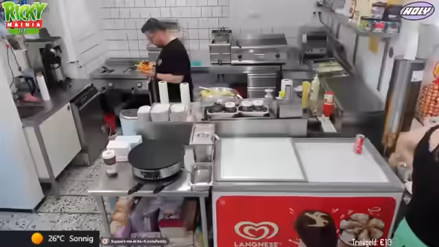 00:03:00Der Stream beginnt mit einer chaotischen Morgenroutine im Freibad-Imbiss. Der Streamer ist müde und überfordert, spricht aber gezielt mit dem Chat, um den Betrieb zu organisieren. Kira, die Tochter einer Mitarbeiterin, übernimmt die Kasse vorne. Es werden technische und organisatorische Probleme angesprochen, wie ein nicht funktionierender E-Roller, ein vollen Slush-Eis-Automaten und die mangelnde Vorbereitung des Crepe-Teigs. Die ersten Kunden, Rentner, kommen und bestellen Kaffee, was zu einer leichten Verwirrung bei der Kassenbedienung führt.
