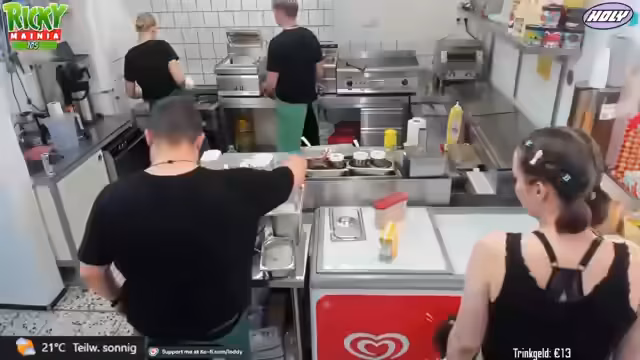 07:02:57Der Stream zeigt den laufenden Betrieb des Freibad-Imbisses mit der Bearbeitung vieler Bestellungen. Es werden verschiedene Produkte wie Pommes, Eis, Süßigkeiten und Getränke an Kunden verkauft. Die Preise und die Optionen für die Bestellungen werden ständig kommuniziert und die Kunden werden durch eine Nummernanzeige aufgerufen. Der Fokus liegt auf einem reibungslosen Ablauf und der schnellen Abwicklung von Einkäufen.