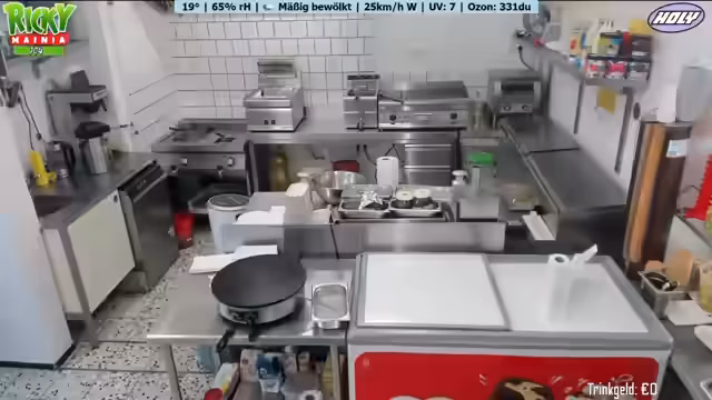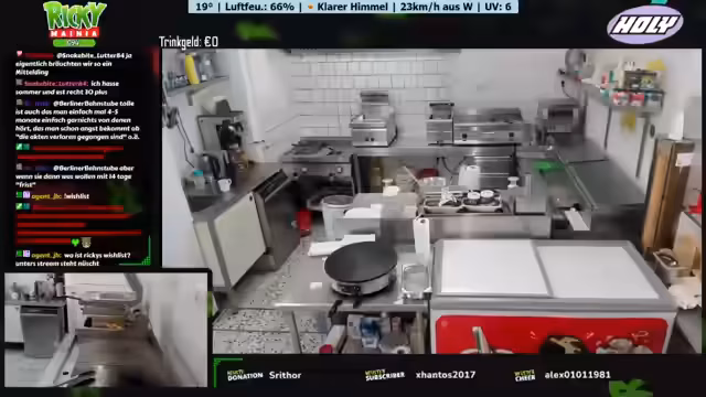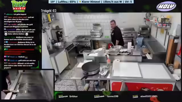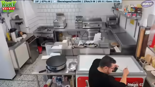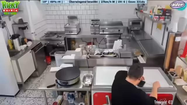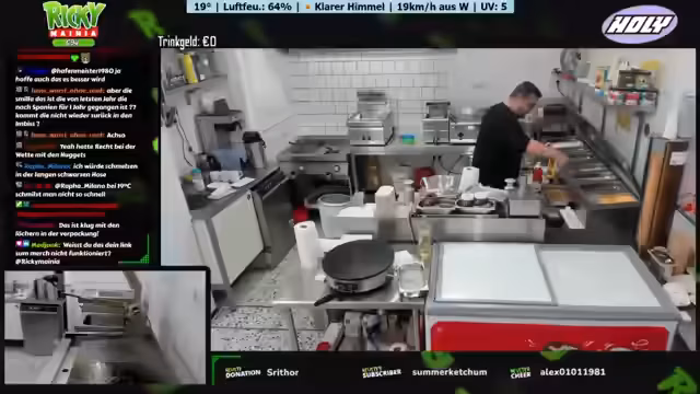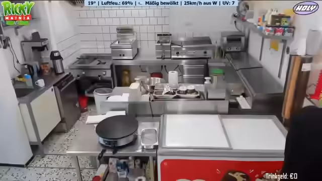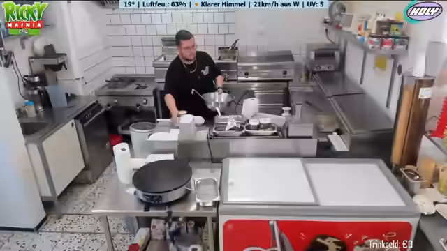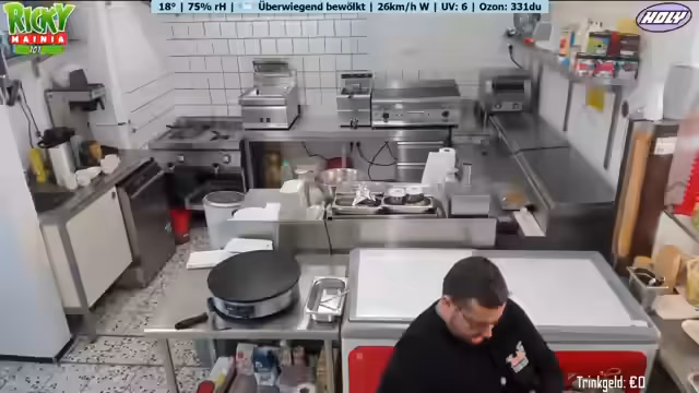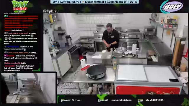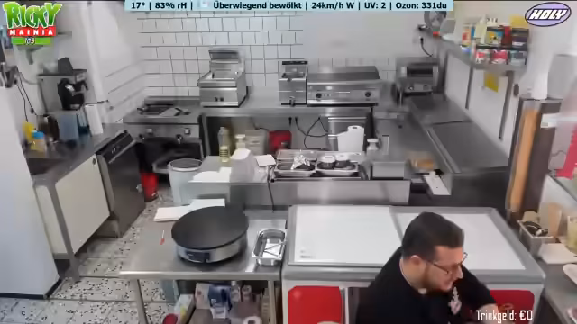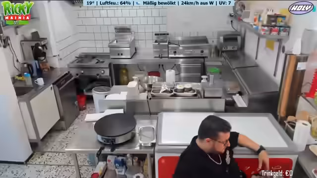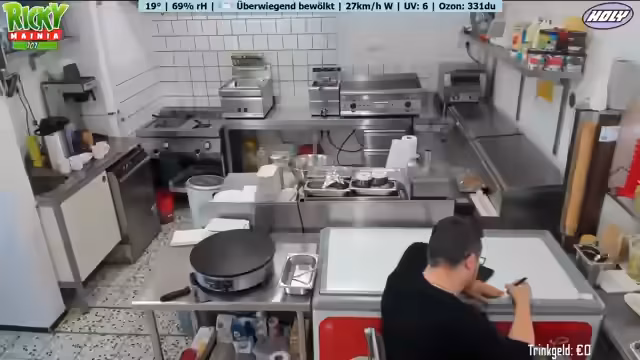 Ein neues Wetter-Display mit Anzeige von Temperatur, Luftfeuchtigkeit und Windrichtung wird vorgestellt. Ein Geburtstagskind spendiert Kaffee und Kuchen. Der Betreiber plant Personal aufgrund eines Ausfalls und der erwarteten Hitze. Diskussionen über Getränkeauswahl, bevorstehende Veranstaltungen und die Notwendigkeit von Sauberkeit im Imbissbetrieb werden geführt. Der Streamer spricht über seine Entscheidung, vorerst kein GTA-RP mehr zu spielen.