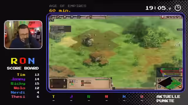 03:49:10Es wird darüber gesprochen, dass man ab jetzt angegriffen werden kann und wie lange das Spiel noch dauert. Die verbleibende Spielzeit beträgt eine halbe Stunde. Es wird überlegt, ob man angreifen soll oder nicht, und es wird festgestellt, dass man langsam ist, aber es schlimmer sein könnte. Es wird überlegt, wie man den Plan von Leben umsetzen kann, aber es fehlt das Wissen darüber. Die verbleibende Spielzeit beträgt in Echtzeit nur noch eine Stunde. Es werden Bogenschützen produziert und überlegt, ob man eine zweite Mühle bauen soll, um mehr Essen zu produzieren. Viele Leute faulenzen, und es wird überlegt, ob Ricky die eigene Basis angreifen kann. Es werden ein Marktplatz und eine Schmiede gebaut. Es wird nach einem Button gesucht, um inaktive Bauarbeiter zu finden. Es werden Gebäude der Feudalzeit gebaut. Es wird überlegt, ob die Punkte im Spiel die gleichen sind wie die Punkte am Ende. Es werden mehr Felder gebaut und aufgeforstet. Es wird vermutet, dass Angreifen viele Punkte bringt. Es wird versucht, mehr Punkte zu sammeln, aber es ist unklar, wie man das macht. Es wird überlegt, ob man Gebäude bauen soll, und es wird festgestellt, dass Gebäude bauen keine Punkte bringt. Es wird vermutet, dass man dem Gegner Punkte wegnehmen kann. Es wird überlegt, ob es Sinn macht, anzugreifen.