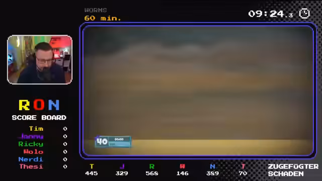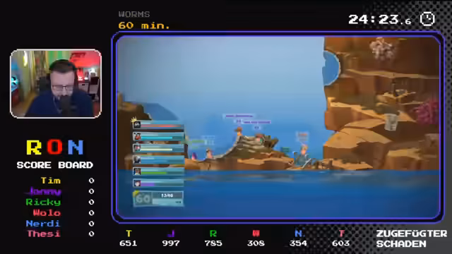 01:32:32Es wird überlegt, Johnny und Nerdy auszuschalten. Es wird überlegt, wie man Johnny am besten beendet. Es wird überlegt, eine Lenkrakete zu benutzen. Es wird überlegt, ob man den Wind berücksichtigen muss. Es wird überlegt, ob man eine Allianz mit Tisi eingehen soll. Es wird überlegt, ob man Johnny angreifen soll. Es wird festgestellt, dass Johnny schon wieder etwas baut. Es wird überlegt, wie man sich am besten positioniert. Es wird sich darüber lustig gemacht, dass man erklärt, wie man jemanden umbringt. Es wird überlegt, wie man die Platzierung der Würmer am Anfang verbessern kann.