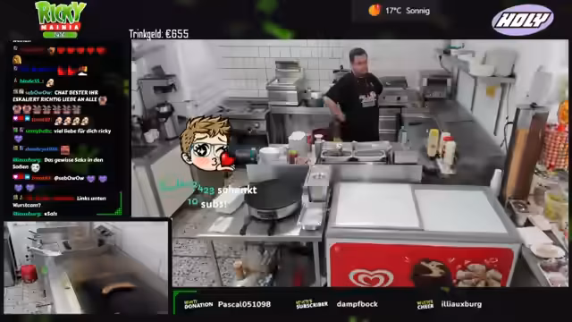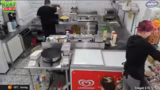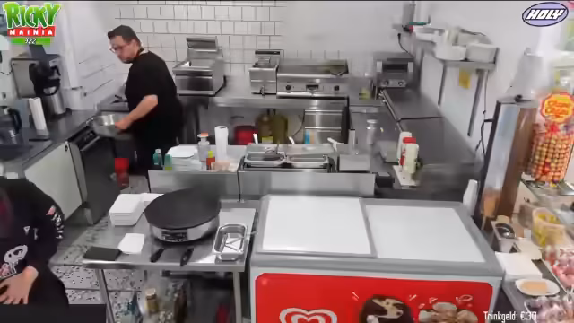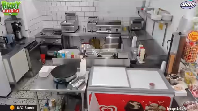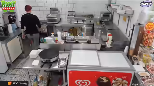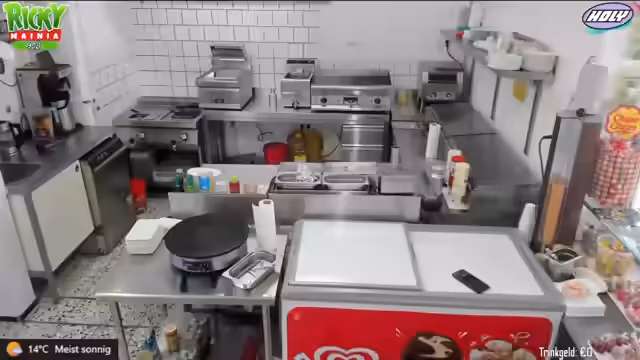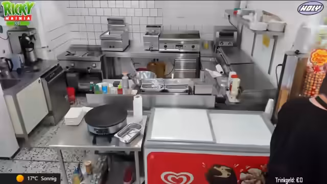 03:46:56Ein großer Teil des Streams beschäftigt sich mit der Organisation der Küche im Freibad. Dabei werden verschiedene Geräte und Arbeitsabläufe gezeigt wie der Pommes-Heißhalter, die Fritteusen für glutenfreie und vegane Nuggets und die spezielle Sauce für Chicken Nuggets. Auch die Zubereitung von Crepes, Bratwürsten und die Herstellung von selbstgemachter Currysoße wird erklärt.