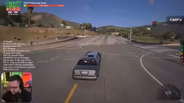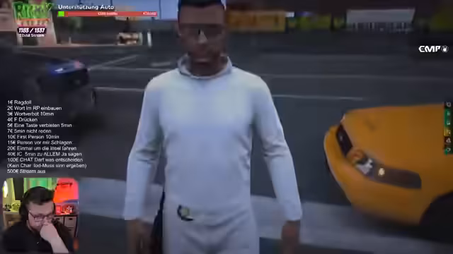 02:38:13Der Stream startet mit einem improvisierten Rollenspiel-Segment. Der Streamer interagiert mit einem Chat-Mitglied namens Erich, der sich als Taxifahrer ausgibt und behauptet, seit 2020 eine Taxi-Firma gegründet zu haben. Die Unterhaltung ist geprägt von skurraren Dialogen, unterbrochen von Anekdoten über Erichs Beruf als Zuhälter und Autovermieter, während im Hintergrund Kniebeugen für Spenden gezählt und ausgeführt werden. Das Thema der Kniebeugen für 1€ wird wiederholt erwähnt und umgesetzt.