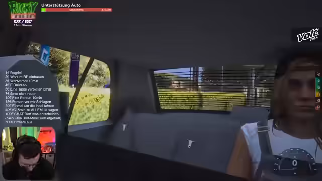 04:31:25Der Stream beginnt mit einer scheinbar zufälligen Identifikationsrunde, bei der Teilnehmer versuchen, einander anhand von Merkmalen zuzuordnen. Es geht um eine Zahl mit Gürtel, eine Schwangere in verschiedenen Positionen und komplexe Verwirrung, wer was gesagt hat. Im weiteren Verlauf wird über das Autofahren gesprochen, wobei unklar ist, ob das Mitnehmen eines Autos eine Straftat ist. Die Unterhaltung mündet in der Planung einer Fahrt zu einer Gruppe von Personen, um ein Thema zu klären, und es geht um das Angebot von Massagen im Fahrzeug.