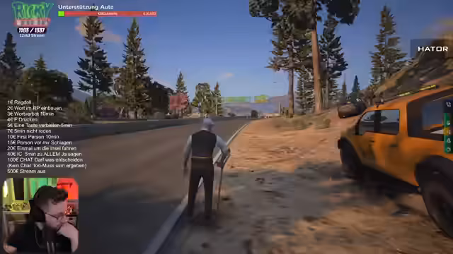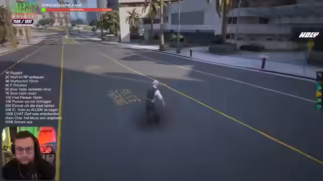00:33:39Für jeden im Stream erhaltenen Euro und Subscription führt der Streamer eine Kniebeuge durch. Anschließend wechselt er in das Spiel 'GTA RP', um auf dem Server mit dem Charakter Kurt zu interagieren. Es kommt zu Spannungen mit anderen Spielern, was zu einer verbalen Auseinandersetzung führt. Der Streamer erwähnt zudem geplante Kooperationen und Events wie den Kundensonntag, bei dem die Gang 'Echo' um Kunden werben und 'Lost' diese abfangen soll.