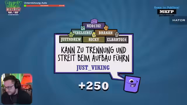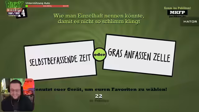 00:08:55Der Stream beginnt mit technischen Schwierigkeiten bei Spotify. Nach dem Begrüßung der Community wird spontan ein Anruf bei Sheri geplant, um nach ihrem Wohl zu fragen. Der Streamer initiiert daraufhin eine Runde Jackbox, bei der alle Zuschauer über die Webseite jackbox.tv teilnehmen können. Nach einigen technischen Startschwierlichkeiten wird der Raumcode MKFP veröffentlicht und die Runde beginnt, wobei das Ziel ist, die witzigste Antwort zu finden und sich so Punkte zu sichern.