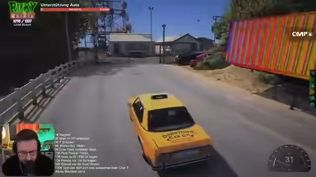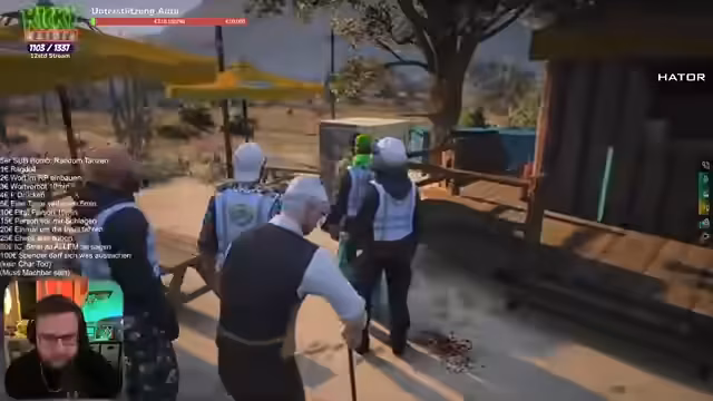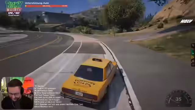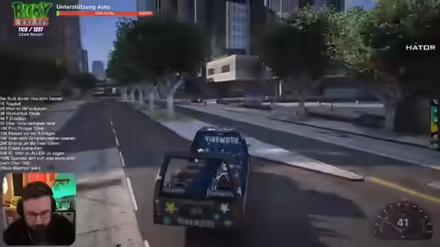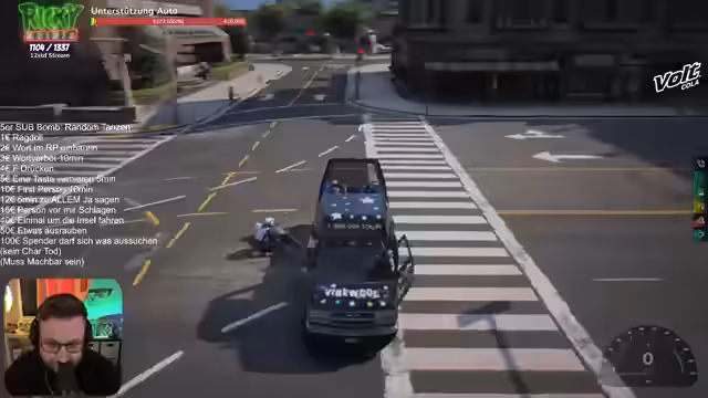 00:36:27Das Gameplay beginnt chaotisch, mit mehreren Charakteren, die gleichzeitig ins Auto einsteigen wollen, und dem Streamer, der mit den Steuerungen und der Overhead-Kamera kämpft. Die Zuschauer interagieren intensiv, indem sie Spendenaktionen tätigen, die ihm erlauben, Dinge zu tun wie aus dem Auto springen oder verschiedene Gewerbe zu übernehmen. Das Tempo ist hoch und voller Unordnung.