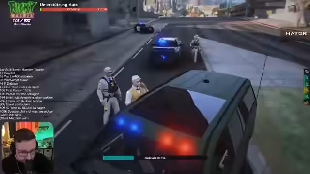 02:12:04Die finale Phase des Streams dreht sich um eine Verfolgungsjagd mit der Polizei, die durch den Chat ausgelöst wird. Der Streamer versucht vergeblich, die Cops zu 'baiten', indem er auf sie schießt. Dies führt zu einem chaotischen Fiasko, bei dem ein Taxi versehentlich zerstört wird und die Situation völlig außer Kontrolle gerät. Der Streamer beteuert, nichts mit dem Vorfall zu tun zu haben, und sucht eine schnelle Flucht aus der misslichen Lage.