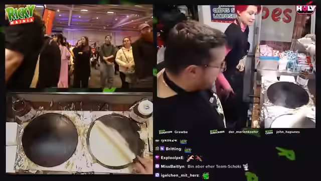 04:12:34Die Nachfrage nach Crêpes steigt deutlich, was zu längeren Warteschlangen führt. Ein Mitarbeiter würzigt die Atmosphäre mit einer lauten Werbeanzeige für die Crêpes und ihre Mitarbeiter. Es werden komplexere Bestellungen mit mehreren Zutaten wie Käse, Schinken, Zimtzucker und Joghurt aufgenommen. Die Zusammenarbeit im Team wird deutlich, während die Mitarbeiter versuchen, den Andrang zu bewältigen und gleichzeitig die Qualität aufrechtzuerhalten.