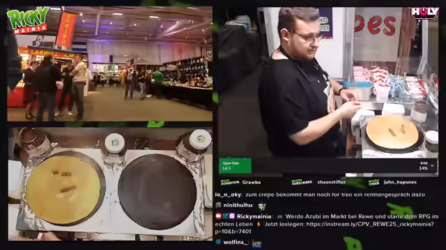03:58:57Ein Mitarbeiter begrüßt Lena Vanille, eine bekannte Person, und bittet sie, einem Fan (Marie) eine Nachricht zu hinterlassen. Es folgen weitere Bestellungen, darunter Käse-Schinken-Crêpes und Desserts. Ein Kunde wird als Fußballfan angesprochen. Gleichzeitig wird angekündigt, dass der Stream ab 18 Uhr live auf Twitch und YouTube ausgestrahlt wird, mit einem QR-Code und Flyern für Zuschauer.
