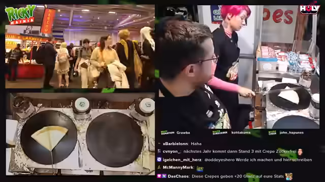 01:02:36Ein Shoutout wurde an Kunschi (Kunschkitty) gerichtet, die im gegenüberliegenden Laden Crêpes anbietet. Diese gegenseitige Unterstützung zwischen verschiedenen Anbietern zeigt die Community-basierte Zusammenarbeit am Event. Der Streamer ermutigte die Besucher, auch den anderen Stand zu besuchen und die veganen Crêpes zu probieren.