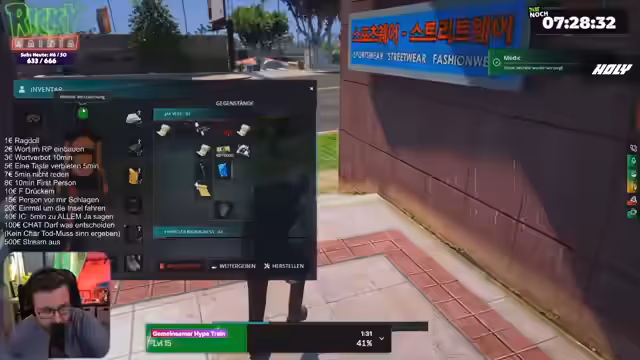 07:32:27Nach einem Vorwurf, einen Unfall gefaked zu haben, eskaliert die Situation. Der Streamer bedroht einen anderen Charakter mit einem Messer, das er als mit Hepatitis infizierte Glasflasche bezeichnet. Es kommt zu einer fiktiven Verletzung, bei der jemand von der Brücke stürzt und einen schweren Unfall mit Beinverletzungen erleidet, der ein Rettungseinsatz der EMS nach sich zieht.