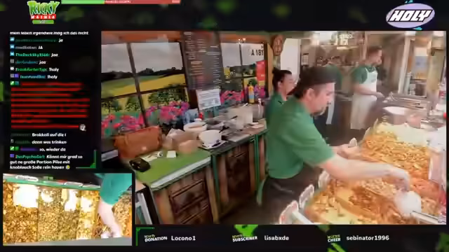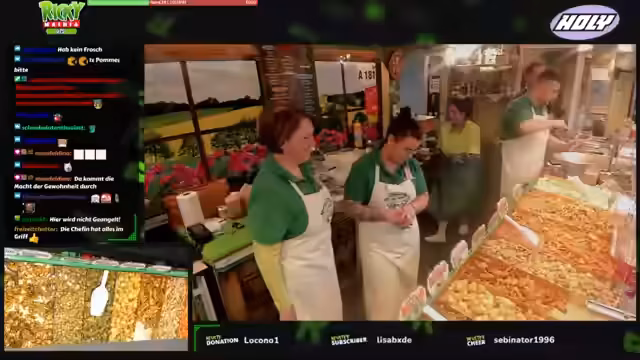 06:25:04Es gibt vielfältige Gemüseoptionen wie Zwiebelringe, Aubergine und Blumenkahl, die in den Pommes oder separat bestellt werden können. Die Preise variieren je nach Größe und Auswahl, wobei die Soßen wie Guacamole, Knoblauch oder Hollandaise inklusive sind. Der Streamer interagiert stetig mit den Zuschauern, nimmt Bestellungen entgegen und gibt Auskünfte über die Produkte. Es werden auch mehrere Bestellungen gleichzeitig bearbeitet, Chips zur Abholung ausgegeben und die Zahlungsmöglichkeiten wie Karte erläutert.