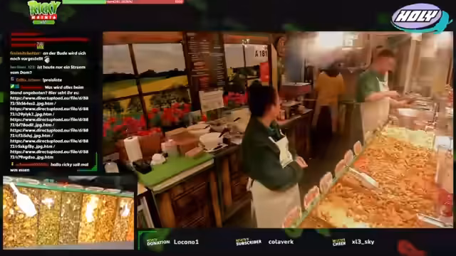00:02:50Der Stream beginnt mit der Begrüßung der Zuschauer und der Vorstellung des Standes „Lust auf Gemüse“ auf dem Hamburger DOM. Ricky stellt sich, seine Tante Gabi und eine Freundin namens Antonia vor. Sie erklären, dass sie verschiedene Snacks anbieten und beschreiben das Angebot an Pommes (Belgisch, Twister, Süßkartoffel) und einem selbstgemachten, veganen und glutenfreien Gemüse-Mix aus Zutaten wie Champignons, Brokkoli, Blumenkohl und Zwiebelringen. Der Fokus liegt auf der Vielfalt und der Frische der Produkte.