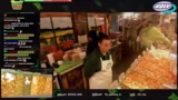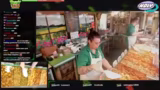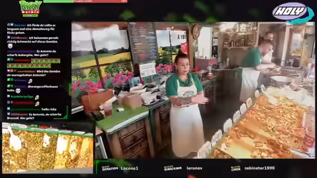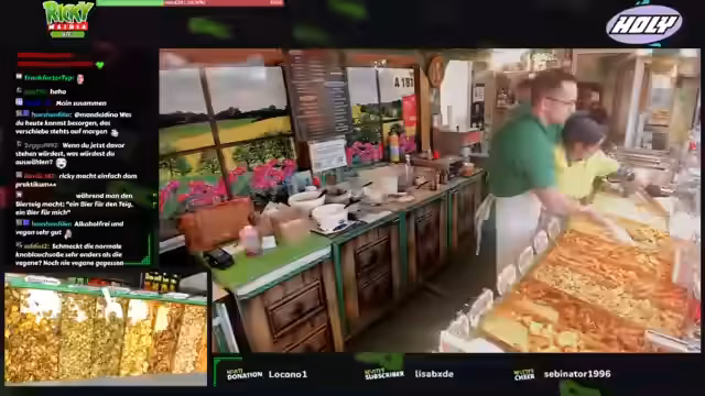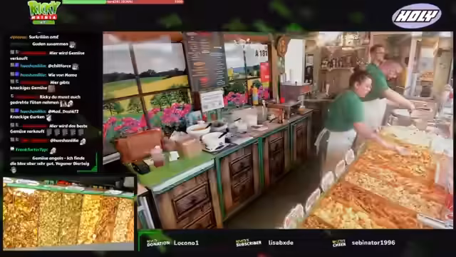 00:06:00Der Stream zeigt live den Verkaufsvorgang an einem Imbissstand. Ricky und Antonia bedienen Kunden, nehmen Bestellungen auf und erklären die Portionsgrößen sowie die Möglichkeit, das Gemüse nach eigenen Wünschen zu mischen. Sie preisen ihre hausgemachten veganen Saucen wie Knoblauchsoße und Hollandaise an. Während des Betriebs fällt ein großer Automat, was kurz für Aufregung sorgt, aber schnell gelöst wird. Die Streamer interagieren ständig mit dem Chat und beantworten Fragen zu den Produkten und Preisen.