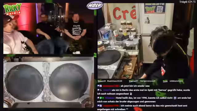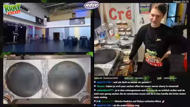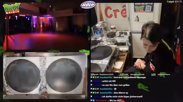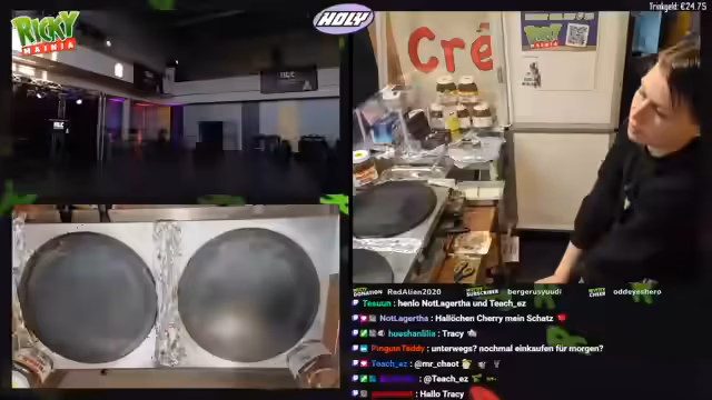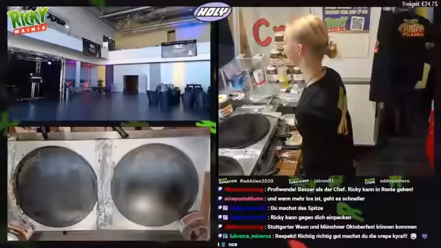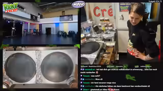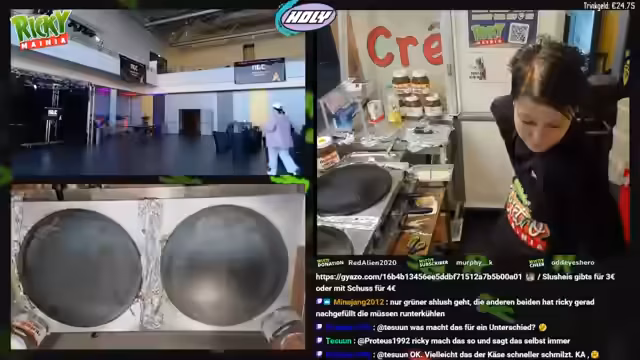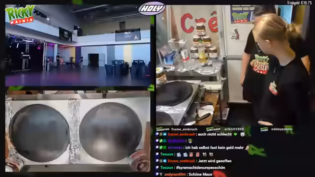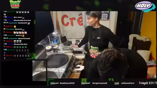 02:43:48Zu Beginn des Streams konzentriert sich der Inhalt auf den Verkauf und die Zubereitung von Crepes. Der Streamer demonstriert die Technik des Faltens und füllt verschiedene Crepes, darunter Joghurt-, Kinderriegel- und Bananenversionen. Die Preise sind klar strukturiert, mit einem normalen Crepe für 5 Euro und einem Zug gratis. Der Umgang mit Kunden wird gezeigt, von der Bestellung über die Bezahlung, hauptsächlich mit Karte, bis hin zum Servieren. Besonderes Augenmerk wird auf die Ausstattung gelegt, wie das schnelle Auffüllen des Teigs und das Verteilen von Nuss-Nougat-Creme.