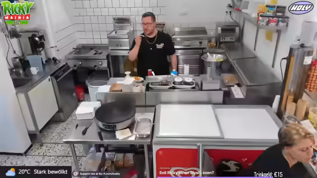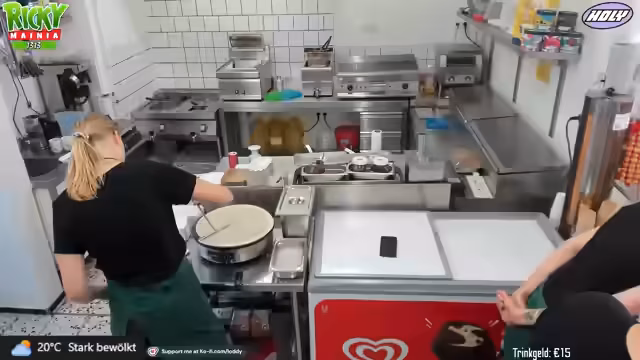 07:56:30Mini-Cherry wendet ihre neu gelernten Fähigkeiten nun direkt am Imbiss an. Sie interagiert mit echten Kunden, nimmt Bestellungen auf und bedient die Kasse. Der Streamer gibt ihr hilfreiche Tipps, wie sie die Waffel- und Crepe-Zubereitung optimieren kann und stellt sicher, dass sie die Qualitätsstandards des Imbisses einhält.