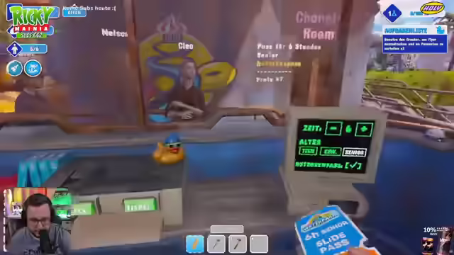 00:12:57Es wird angekündigt, dass man im Spiel mit dem Befehl 'Visit' oder 'Hi Ami' im Spiel erscheinen kann. Es gibt Interaktionen mit virtuellen Besuchern im Freibad, wobei unterschiedliche Altersgruppen (Teenager, Erwachsene, Senioren) und Wünsche (z.B. Rutschenpässe) berücksichtigt werden. Es kommt zu einem Spielabsturz, was ironisch kommentiert wird. Trotz des Absturzes wird das Spiel als toll und klasse bezeichnet. Nach dem Neustart des Spiels werden weiterhin Besucher bedient und es wird versucht, die Twitch-Integration zum Laufen zu bringen, um Mitarbeiter einzustellen. Es wird erklärt, dass man hinter den Namen im Chat 'M' oder 'F' schreiben kann, um das Geschlecht anzugeben. Es wird überlegt, ob man für die Nutzung der Rutsche extra bezahlen lassen soll. Es gibt Probleme mit Besuchern, die sich ohne Armband einschleichen, und es wird ein Hotdog-Stand gebaut, um die Besucher zu versorgen.