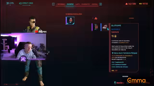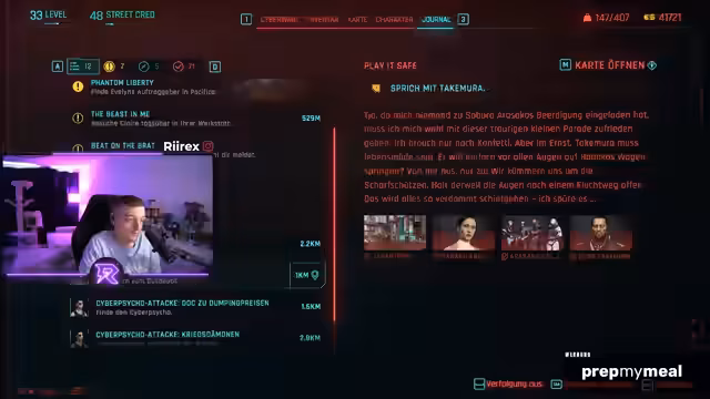 00:00:54Der Stream beginnt direkt und ohne Intro mit der Absicht, das Spiel Cyberpunk fortzusetzen. Der Streamer befindet sich im Questbereich Pandan und hat einen Levelaufstieg erhalten, den er in die Reflexe steigt. Es gibt Pläne, ein AV mit einem elektromagnetischen Impuls (IMP) abzuschießen, indem man ein Satellitenkraftwerk sabotiert. Panam wird als Begleitung erwähnt, während Johnny eine Warnung vor einem möglichen Problem mit dem Implantat gibt. Der Fokus liegt auf der Durchführung des Plans und der Beseitigung von Hindernissen.