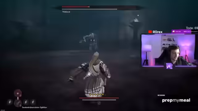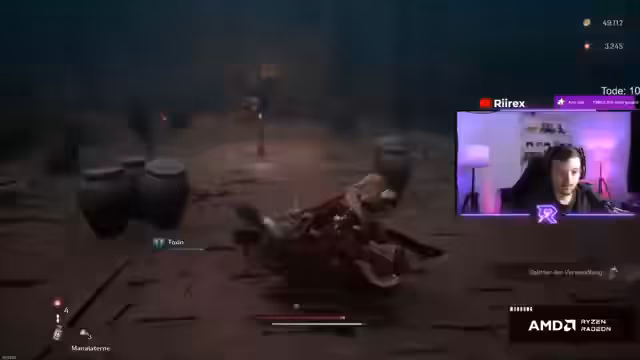 04:19:01Der Streamer kämpft gegen mehrere Bosse, darunter einen fliegenden Fledermaus-Boss und einen großen General. Bei diesen Kämpfen konzentriert er sich stark auf das Timing von Angriffen und Konter-Manövern, wobei er bei bestimmten Attacken sehr frustriert ist und sie zunächst ablehnt. Er testet verschiedene Rüstungen, die seine Chancen verbessern, bestimmte Gegenstände zu farmen. Schließlich findet er den Schmied, seine Waffen und Ausrüstung verbessern zu können, und beginnt mit dem Sammeln von Materialien, um neue Ausrüstungssätze herzustellen.