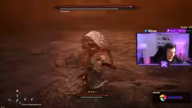 02:27:44Der Streamer kämpft gegen einen Boss in Khazan und stößt auf erhebliche technische Schwierigkeiten. Er macht sich Sorgen über eine scheinbare Bug- oder Design-Problematik, da er konstant Feuerschaden erleidet, der den Charakter töten soll, aber offenbar keinen Verlust an Gnaden-Heilpunkten verursacht. Nach mehreren gescheiterten Versuchen und Frustration über das Timing bestimmter Angriffe, insbesondere eines Konter-Angriffs, der zu funktionieren scheint, entscheidet er sich, diesen Angriff komplett zu ignorieren und stattdessen nur auszuweichen, um den Boss endlich zu besiegen. Er stellt fest, dass das Flammen-Schaden als 'Zähl' gilt und somit den Charakter nicht tötet, und schafft es schließlich, den Boss ohne Treffer zu bezwingen.