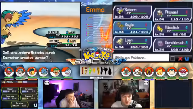 05:43:07Nach einer herben Niederlage in der Arena, die durch Fehler wie einen verzögerten Bodyguard-Einsatz und das Unterlassen von Psycho-Attacken zustande kam, herrscht große Frustration. Der Verlust eines SC-Links mit Mammutel wird als besonders bitter empfunden, da dies ein strategisch wichtiger Verlust für das Team gewesen wäre. Die Situation wird dadurch verschärft, dass das Team nur aus vier Pokémon besteht und die Gegner nicht EV-training haben, was den Kampf ungleich schwieriger macht und den Druck erhöht.
