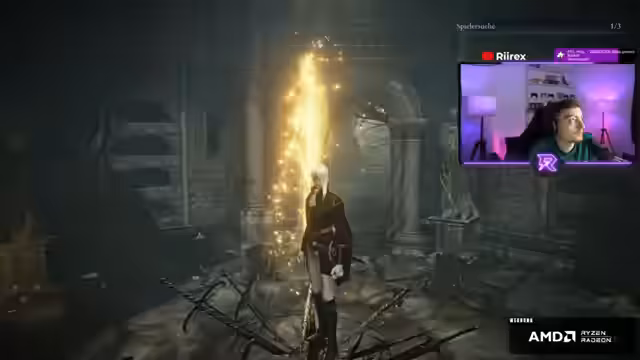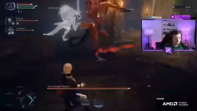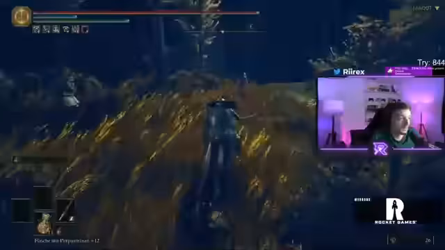 05:32:48Der Streamer erklärt dem Chat die Mechanik des Skalierungs-Systems im DLC. Das Sammeln von Skaraba-Fragmenten ist entscheidend, um die Level von Skad zu erhöhen. Ein höheres Level führt zu mehr Schaden und mehr Ausdauer, was gegen die stark skalierten Gegner und Bosse notwendig ist. Bei seinem Versuch, in das Blaue Gebiet zu gelangen, wird er jedoch durch gefährliche Jump 'n' Run-Passagen und starke Gegner aufgehalten. Er entscheidet sich, den riskanten Weg über einen Wurmgeist zu vermeiden und stattdessen ein Jump 'n' Run in Angriff zu nehmen, was seine angespannte Stimmung weiter verschärft.