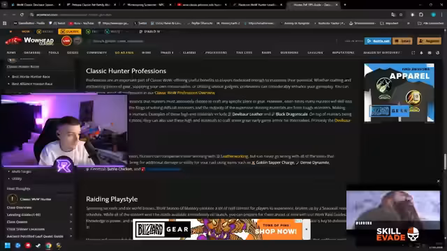 01:09:37Der Streamer befindet sich in der Endphase des Grindings. Seine Ausrüstung und Berufe sind fast fertig und er darf bald twinken. Da er nicht den ganzen Zeit mit Angeln verbringen will, deutet er an, in den nächsten Tagen in ein anderes Spiel zu wechseln. Die aktuelle Priorität ist das Abschlusscrafting des Teufelsaurier-Sets. Er plant, Crafting-Rezepte für Sigi bereitzustellen und benötigt noch letzte Ressourcen wie Mithril und robustes Sprengpulver, um die Gegenstände fertigzustellen.