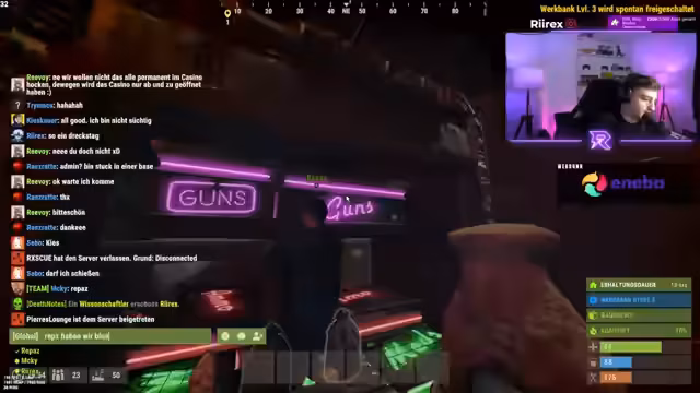 03:14:23Ein interner Konflikt entsteht, als der Streamer bei einem Konfrontationsversuch gegen Chef Strobl zögert, ihn aus Rücksicht auf ihre gemeinsame Vergangenheit zu töten. Dies führt zu Spannungen im Team, da einige Mitglieder eine harte Linie fordern. Die Diskussion dreht sich um Loyalität, Vertrauen und die Prämisse, Rückschläge im Spiel nicht persönlich zu nehmen. Man versucht, eine Lösung zu finden, die sowohl sportliche Fairness als auch den Zusammenhalt der Gruppe wahrt.