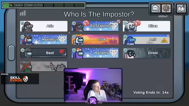 10:35:35Ein Spieler stellt eine Theorie auf, nach der D-Rock der Impostor sein muss, da er behauptet, jemanden in Communications ermordet zu haben. Es wird enthüllt, dass D-Rock die Fähigkeit besitzt, sich in andere Spieler zu verwandeln. Der Streamer beschreibt, wie er den Impostor auf frischer Tat ertappt hat, als dieser sich in 'Maxi' verwandelt hat. Die Gruppe bereitet sich darauf vor, 'D-Rock' zu voten, was jedoch durch andere, stärkere Verdachtsmomente kompliziert wird.