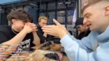 04:08:52Die Gruppe erreicht die berühmte Currywurstbude, die als eine der schärfsten Deutschlands gilt. Man diskutiert intensiv über die Schärfeskala von 5 bis 10, wobei ein Glücksrad für die Auswahl der Schärfe gedreht wird. Es wird festgelegt, dass eine Stufe 10 als ganze Portion gegessen werden muss, während die anderen Stufen flexibler sind. Probiert werden verschiedene Sorten, darunter eine normal scharfe Currywurst und eine auf Schärfe spezialisierte Variante. Während des Verzehrs wird das Brennen im Mund und Rachen deutlich spürbar, die Gruppe bleibt aber bei guter Laune.