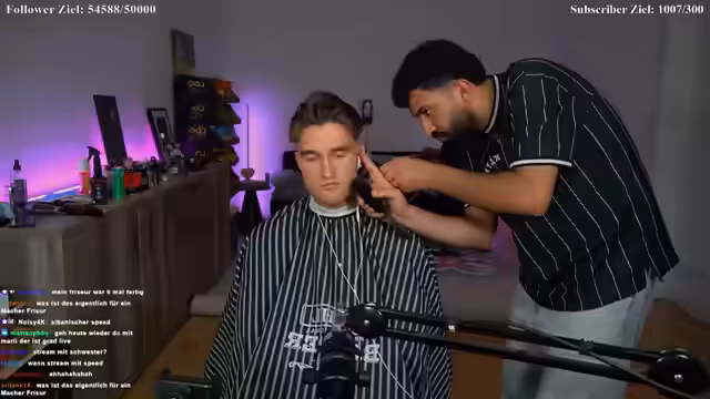 01:29:20Der Fokus des Streams verlagert sich auf den Haarschnitt. Der Friseur Diyar arbeitet an einem sogenannten Burst Fade. Während des Schnitts gibt es technische Schwierigkeiten mit dem Licht und dem Stuhl. Am Ende wird das Ergebnis gezeigt und der Streamer bittet das Publikum, die Frisur von 1 bis 10 zu bewerten. Er erhält durchweg sehr positive Bewertungen im Chat.