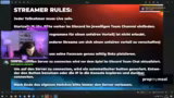 02:30:02Technische Vorbereitung und organisatorische Hinweise für die teilnehmenden Streamer werden gegeben. Jeder Streamer muss mit seiner Facecam mittig links sichtbar sein. Der Stream wird auf mehreren Kanälen gleichzeitig übertragen, wodurch ein gemeinsamer Chat entsteht. Um Cheater auszuschließen, werden strenge Regeln aufgestellt und das Kompetenz-Team steht für Support bereit.
