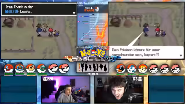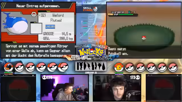 06:59:27Im Verlauf des Runs kommt es zu einer extrem knappen Situation, bei der ein wichtiges Pokémon nur noch mit wenigen Trefferpunkten am Leben ist und gefangen werden muss. Der Streamer bittet seinen Mitspieler um Vertrauen und drängt ihn, einen speziellen Ball zu werfen. Gleichzeitig wird über das weitere Vorgehen und die Zusammenstellung des Teams für die verbleibenden Kämpfe diskutiert.