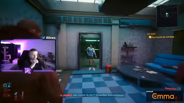 01:03:00Nachdem er die Blutspur verfolgt hat, trifft der Streamer auf den Cyberpsycho Royce. Die Auseinandersetzung ist brutal und verläuft schnell, da Royce sich in einen Autobauern verwandelt. Gleichzeitig erhält er einen Anruf von River, die ihm von der Verhaftung ihres Freundes Reva erzählt. River ist sichtlich verärgert über die Situation und über ihren Freund. Sie bittet V um Hilfe, was eine neue Mission und eine tiefere Involvierung in ihre Geschichte auslöst.
